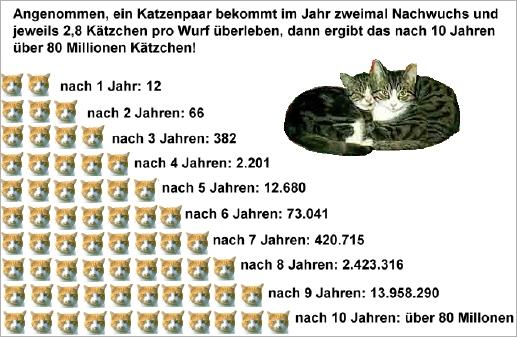 Millionen unerwünschte Katzen werden jedes Jahr geboren. Viele Katzenbabies streunen umher. Ein Teil von ihnen wird überfahren, erschossen, misshandelt oder stirbt an einer unbehandelten Krankheit. Die Überlebenden werden sehr schnell geschlechtsreif und gebären 5 oder 6 Kätzchen. So beginnt der Teufelskreis! Alle, die ihr Tier nicht kastrieren lassen, machen sich mitschuldig an dem Elend der Katzen, denn der Nachwuchs einer Kätzin kann nach 10 Jahren über 80 Millionen Tiere betragen! |