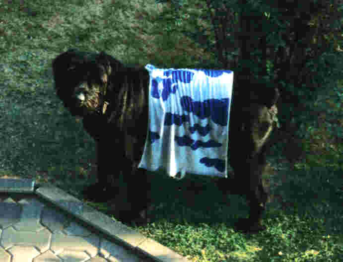 Ben, *15.12.1990, der Riesenschnauzer, zog auch im Alter von 12 Wochen bei uns ein. Einen Riesenschnauzer wollte ich nie haben. Die abgeschnittenen Ohren gefielen mir nicht. Ben hatte seine natürlichen Hängeohren und sah so viel süsser aus. Seinen Namen erhielt er als Erinnerung an unseren ersten Ben. Wir riefen ihn aber meistens mit seinem Kosenamen "Bärchen". Unser Tierarzt behandelte ihn, die Würmer verschwanden und ebenso die Schweinereute. Nach ein paar Wochen hatten wir einen gesunden lebenslustigen und sehr verspielten Hund. Unser Bärchen war leider nie an das Autofahren zu gewöhnen. Er war ein absoluter Fußgänger. So musste unser Tierarzt bis zu seinem letzten Tag Hausbesuche machen. Ben war sehr gelehrig und wollte überall dabei sein und helfen. Wenn ich vom Einkaufen nachhause kam, kam er mir freudestrahlend entgegen und ich musste ihm etwas zum Reintragen geben. Er tauschte natürlich nur gegen ein Leckerli.