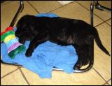 Nun ja, wenn mal keiner da ist, dann passt Chiba auf mich auf und wenn sie schläft schnapp ich mir mal eine Blume...stehen ja genug rum und die kann man sicher auch anfressen, wie man auch den Papiermüll zerkauen kann. Ich bringe etwas Stimmung ins Haus, das freut sicher alle Bewohner *g* Wenn ich müde bin, hau ich mich in mein Bettchen, versuch Chiba zum Spielen aufzufordern, aber sie spielt nicht mehr so gern. Naja, kuscheln ist ja auch schön. Ich versteh nicht warum hier Stoff mit Karos auf der Erde liegt..hmm...werd mal versuchen die weißen Vierecke zu entfernen, die braucht ja sicher keiner hier ;-) Chiba brummelt zwar, aber sie lässt mich kauen und guckt dann zu. Warum zerkleinert sie eigentlich nichts? Das macht doch richtig Spaß, jedenfalls mir, nur Frauchen findet es nicht so lustig und schimpft, tsts. Na gut, dann lass ich noch 1 Viereck im Teppich und such mir was anderes. Der Garten ist auch aufregend, da verlauf ich mich sogar und wenn ich mal irgendwo hängen bleib, quietsch ich bis Frauchen mich reinschleppt. Ich lass mich gern tragen, ist gemütlich haha
